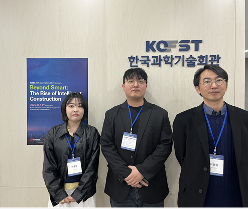 건축정보기술연구실(A.I.T., 지도교수: 이권형)의 이권형 교수와 대학원생 김백준, 이유정 (박사과정)이 2025년 11월 14일 한국과학기술회관에서 개최된 KIBIM 2025 국제심포지움에 참석하였습니다. BIM 분야의 최신 동향과 국내외 전문가들의 연구 성과를 청취하였고, 이번 심포지움에서는 구글 XR Engineering의 Bernard Kress 박사의 '스마트 건설을 위한 스마트 글래스 및 증강현실 헤드셋' 발표를 비롯해 Autodesk Korea의 Chan Joo Oh 대표의 'AECO 분야를 위한 연결된 미래' 등 글로벌 기업들의 기조연설이 진행되었다.