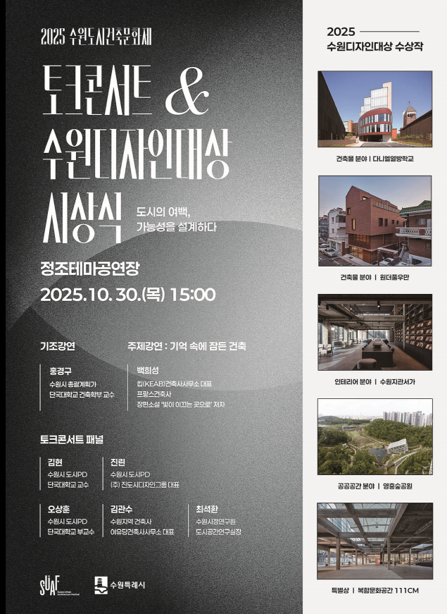○ 기 간: 2025. 10. 29.(수) ~ 11. 1.(토) [4일간] ○ 장 소: 정조테마공연장, 수원시미디어센터, 팔달문화센터 등 ○ 프로그램: 오픈시티수원, 토크콘서트&수원디자인대상 시상식, 도시건축 시네마, 도시건축 사진강좌, 전문가와 함께하는 건축이야기, 전시(대학생 국제워크숍 작품전, 건축사 사진전) ○ 종합안내: https://litt.ly/suaf.kr