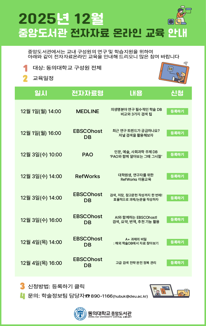 중앙도서관에서는 교내 구성원의 연구 및 학습지원을 위하여 12월 전자자료 온라인 교육을 다음과 같이 안내해 드리오니 많은 참여 바랍니다.