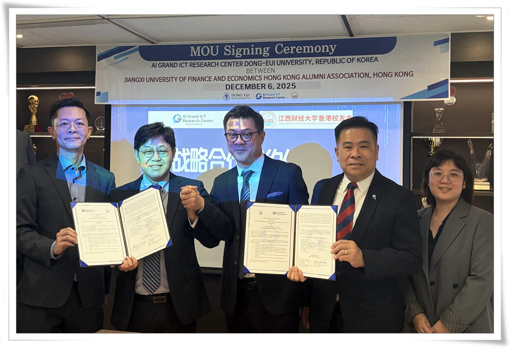 동의대학교 인공지능그랜드ICT연구센터(센터장 정석찬)는 12월 6일 중국 장시재경대학교 홍콩동문회와 국제 정보통신기술(ICT) 및 인공지능(AI) 분야 협력 강화를 위한 업무협약을 체결했다.